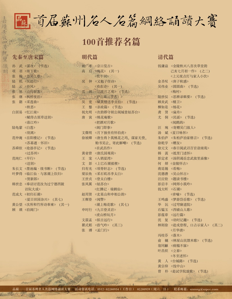 苏州市公共文化中心、苏州市名人馆主办,开云手机平台等多家公司、文化机构协办的“品蘇——首届苏州名人名篇网络诵读大赛”,将在2016年5月至9月期间举行,本次大赛,开云精心挑选了历代苏州名人传世100篇经典佳作,参与者可从中挑选一篇吟诵,以这些历经时光淬练的文字与世界各地的人们分享人生智慧、情感共鸣。