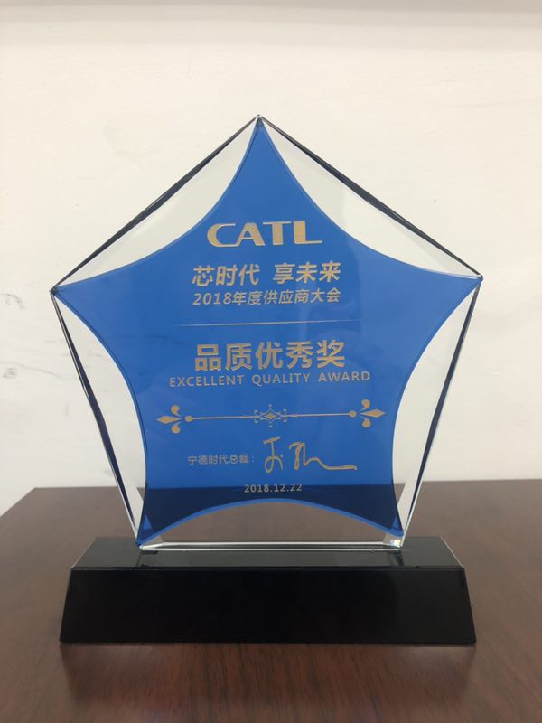2018年12月22日,宁德时代新能源科技股份有限公司年度供应商大会,在宁德隆重举行,此次供应商大会仅颁发两个品质优秀奖,开云手机平台子公司苏州捷力新能源材料有限公司获此殊荣,且是隔膜供货商中的唯一获奖者。