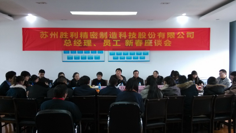 一月二十八日下午,公司工会举办了新春座谈会,总经理章海龙先生和参加座谈的员工,进行了两个小时的沟通交流,听取了员工对工作、学习、生活和员工个人发展目标等方面的想法和建议,对此,章总作了耐心细致的回答,现场气氛热烈,发言踊跃。通过此类活动,加深了员工和公司管理层的沟通,融洽了劳资关系,营造了和谐气氛,有利于公司各项工作的顺利开展。 公司行政人事总监,工会负责人参加了座谈会.